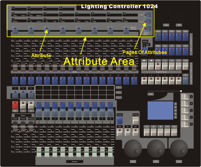 Attribute area: Including 8 buttons and 3 buttons. Each < Attributes> button carries two attributes, respectively controlled by and . When button is switched at side, the faders in the fixture area can be used to control the corresponding attributes.